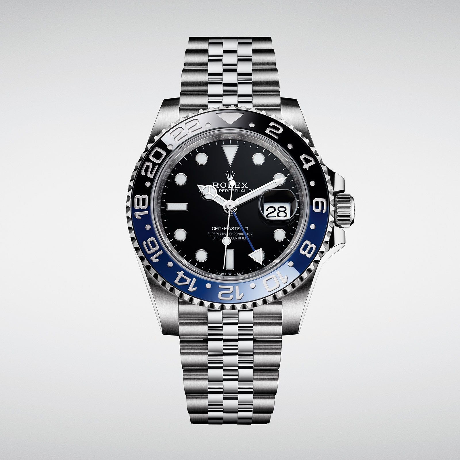 GMT-Master II, also known as the "Batgirl," which features a blue and black Cerachrom bezel and a Jubilee bracelet.