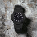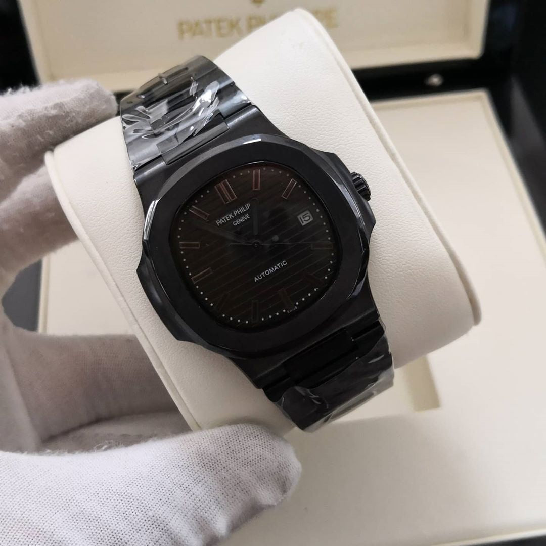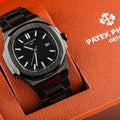 Nautilus watch with a black dial and a black band.